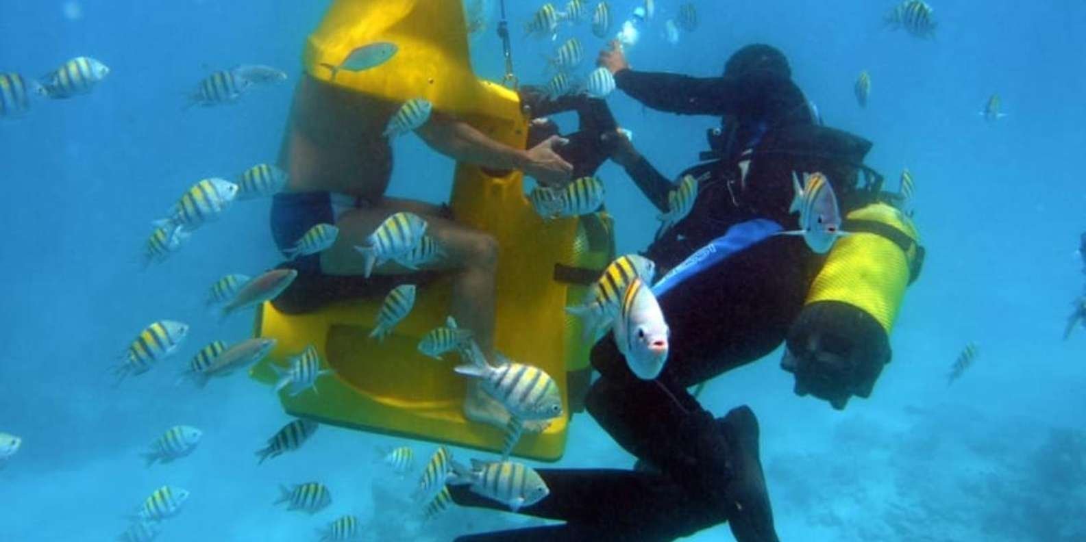 Be picked up from your hotel and head to the beautiful coast of Cabeza de Toro in Punta Cana. Board a boat that will take you to a comfortable platform where you will be received by specialized personnel. With your Dive Master guide, carry out an underwater adventure comfortably seated on an Underwater Scooter without using a mask or tube, and breathe normally at a depth of 3 to 5 meters.